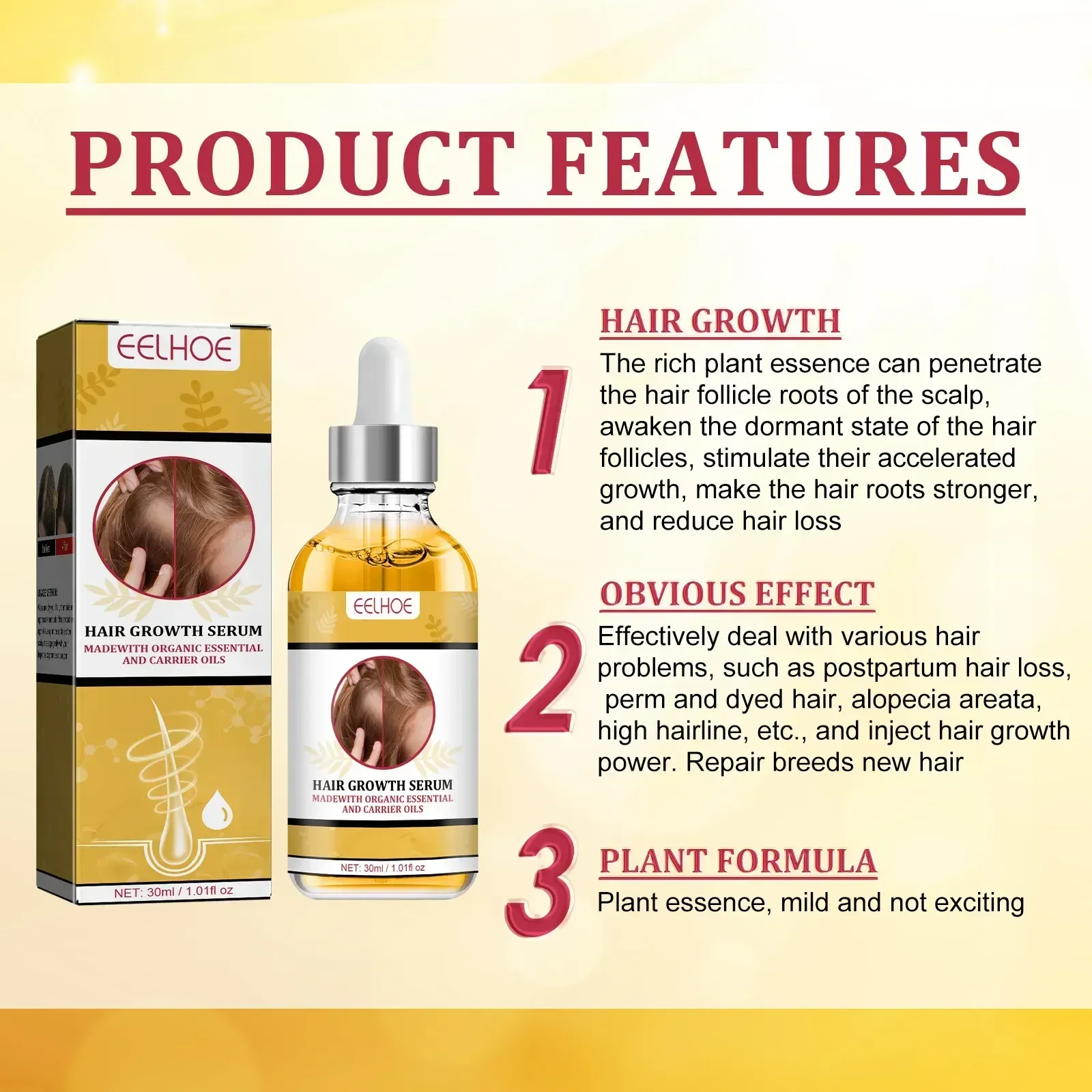 Efficacy:Promotes hair growth and prevents hair loss. Nourishes hair and deeply repairs hair follicles. It also moisturizes hair, leaving hair shiny, silky and soft.