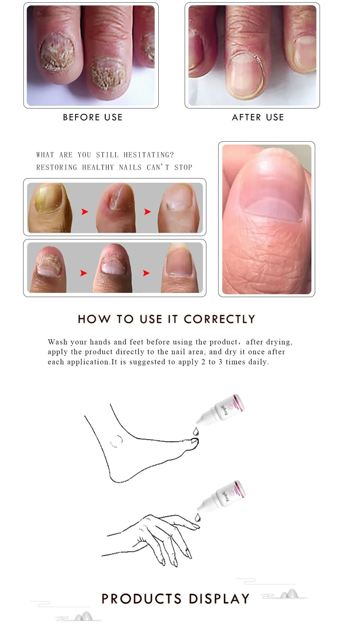Wash and drying your hands and feet firstly,apply the product directly to the nail area and dry it once after each application. It is suggested to apply 2 to 3 times daily.