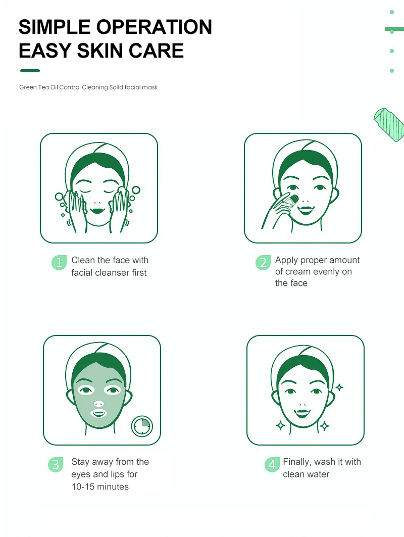 The green tea solid cleansing mask contains green tea extract, which can effectively clean the skin pores, deeply clean up skin dirt, adjust the skin’s water and oil balance, replenish skin moisture, and nourish the skin.