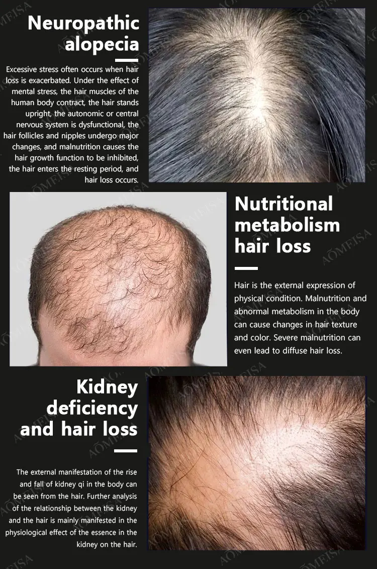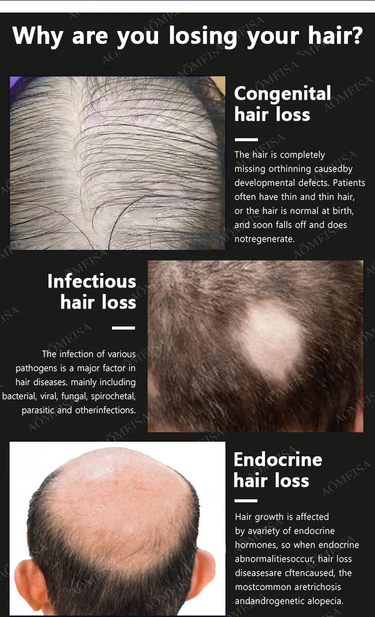 Hair loss caused by hair coloring,Seasonal hair loss,Postpartum hair loss,Upward movement of hairline,Oily fatty hair loss,Stress hair loss,M hair loss,Diffuse hair loss,Genetic hair loss,Late-night hair loss,patchy baldnes
