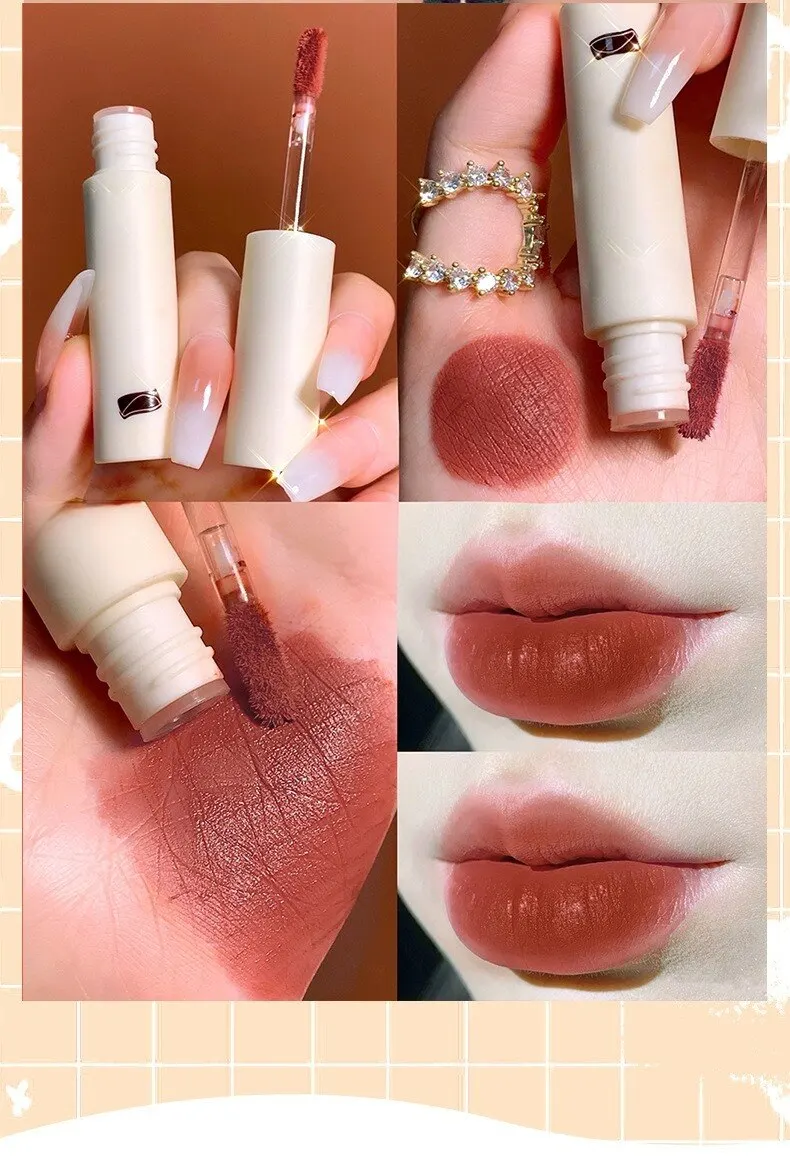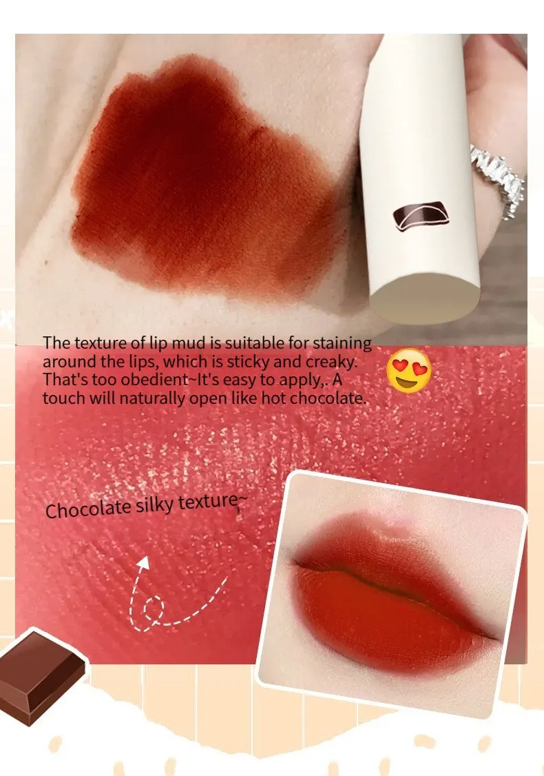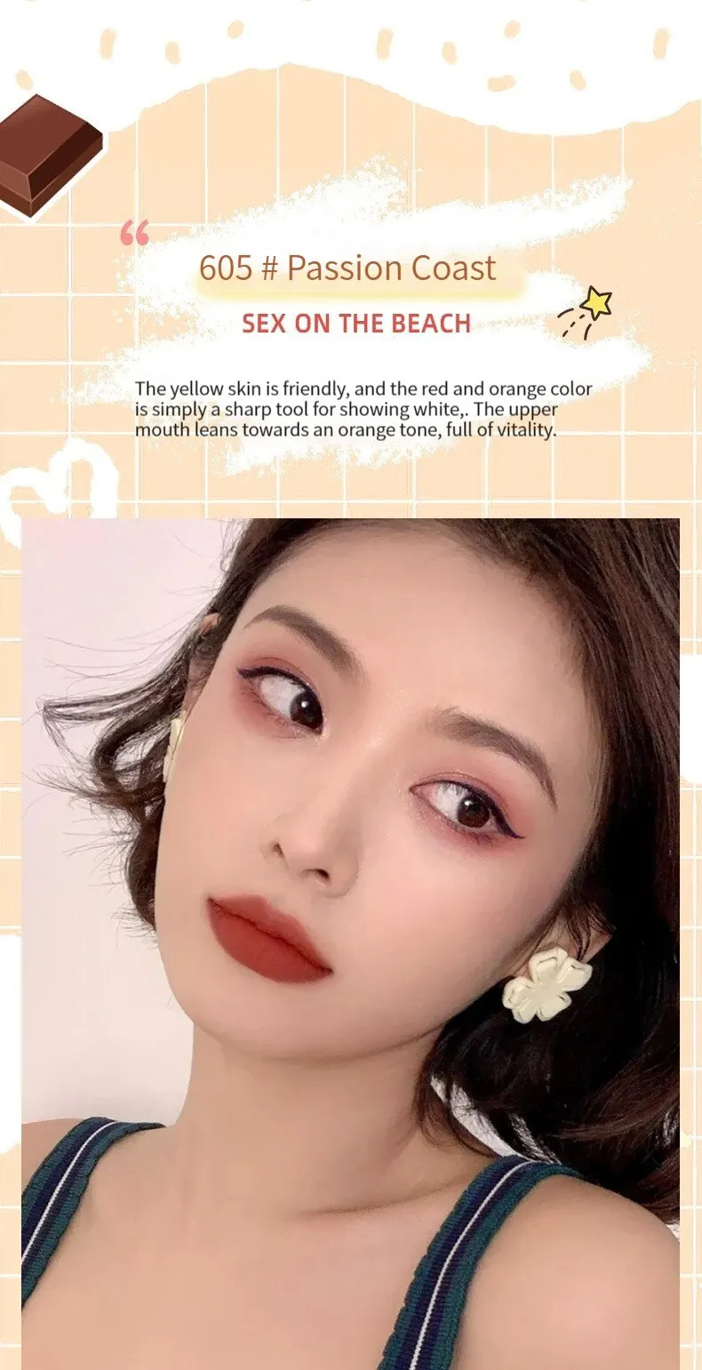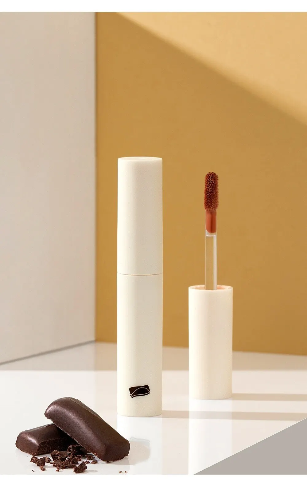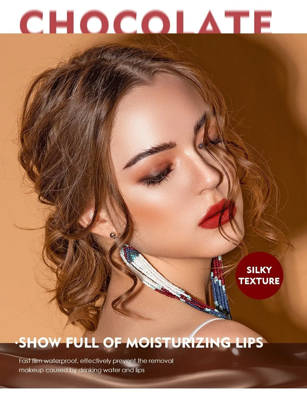 Trendy lip gloss lipstick with cool chocolate packaging, waterproof and long lasting, velvet lip glaze cosmetics, red lipstick for women.